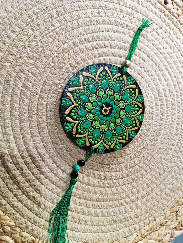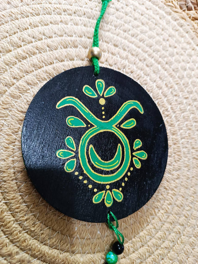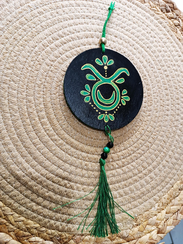Jolie suspension murale sur le thème des signes astro "taureau" , agrémenter de perles et de pompon .