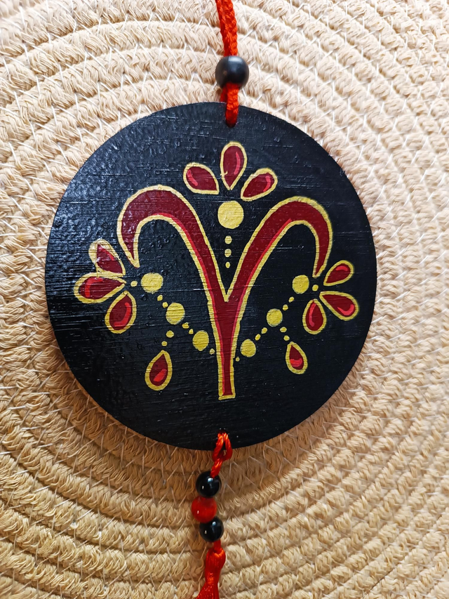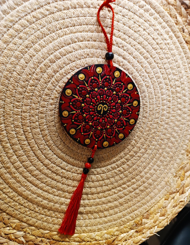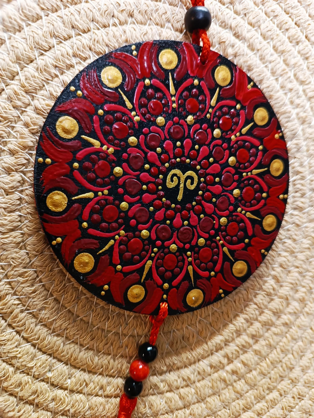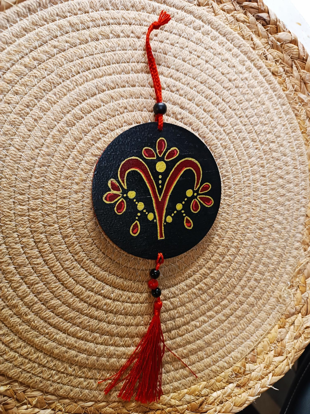 Jolie suspension murale sur le thème des signes astro "belier" , agrémenter de perles et de pompon .