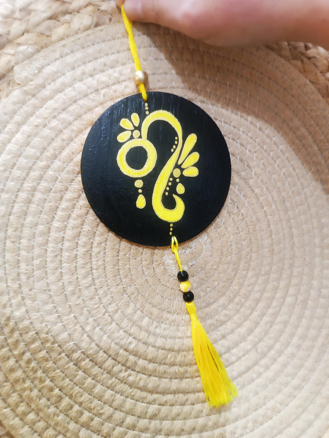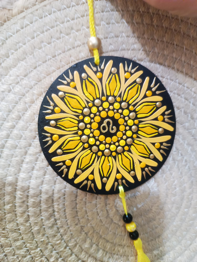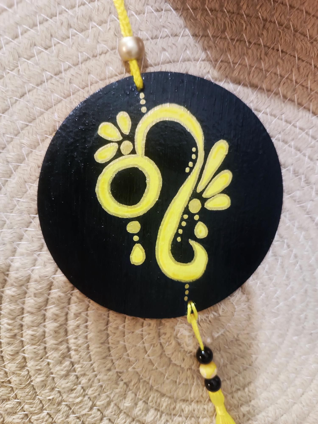 Jolie suspension murale sur le thème des signes astro "lion" , agrémenté de perles et de pompon .